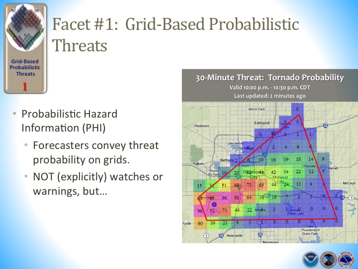 FACETs will allow forecasters to improve upon standard weather watches and warnings by delivering detailed hazard information through the use of “threat grids” that are monitored and adjusted as new information becomes available.