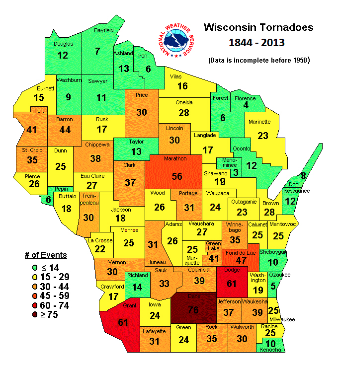 Regular readers know that I have a (yet another) strange interest in tornadoes and severe weather, perhaps because I’ve managed to live in almost all of Wisconsin’s Tornado Alley, such as it is, including the brown county and the three red counties in the bottom half of the map: