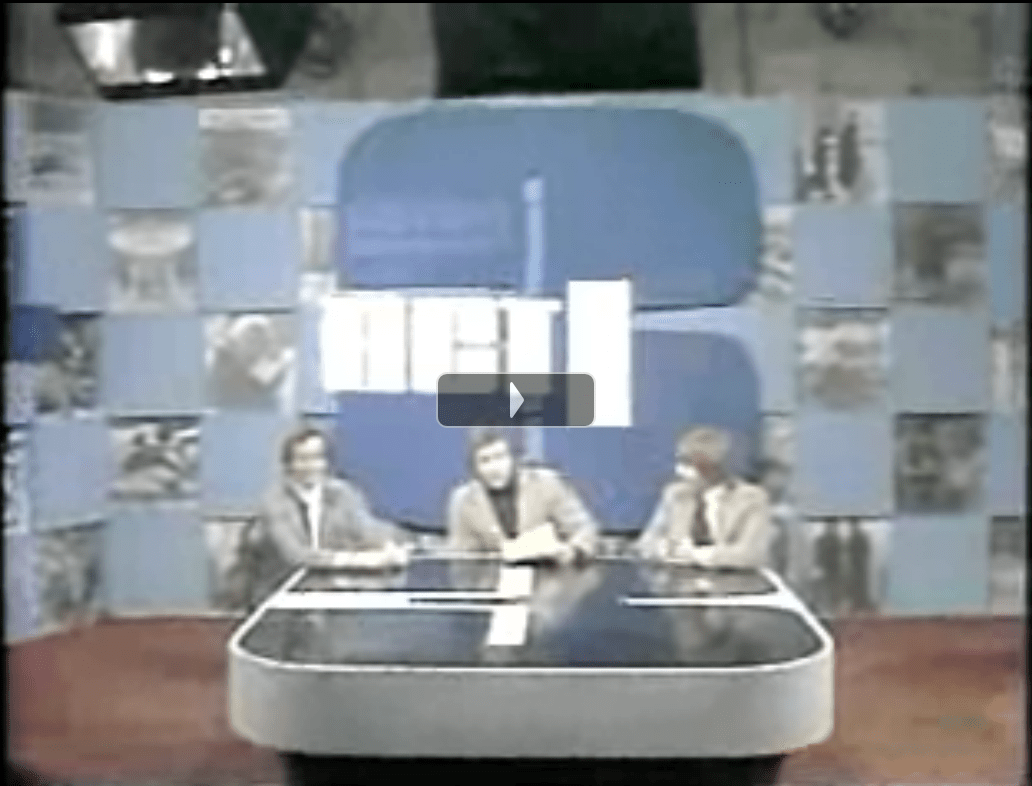 Doing the news on the Big Giant 3 set this night were Tedd O’Connell (center), the so-called “hipster newsman” whose career highlights included visiting Cuba with Mayor Paul Soglin (in the middle); sports director Jim Miller (left); and reporter and weatherman John Digman, who used a ’40s car antenna as his weather map pointer.