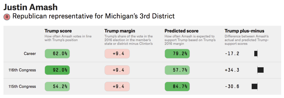 So if Amash is opposed to Trump, he must be one of those renegades who doesn’t vote with his own party, right? Well, FiveThirtyEight did the math …