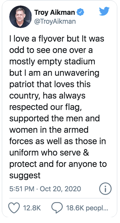 The comments, though, were evidently seen by some as anti-military (which they really weren’t). So come Tuesday, Aikman took to Twitter to clarify that his joke was not meant to disrespect the military.