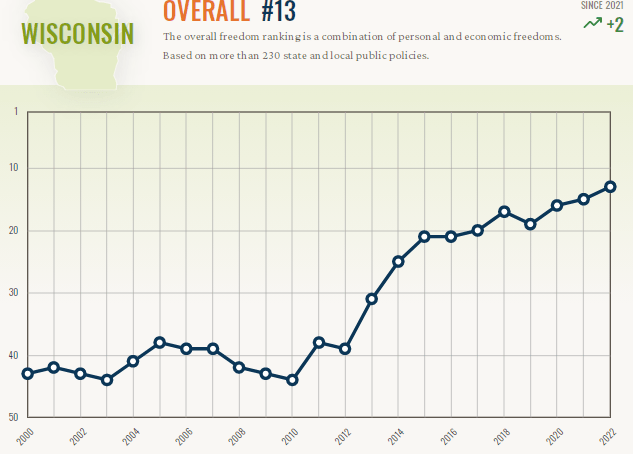 Note when Wisconsin became a more free state — after Gov. James Doyle and legislative Democrats were replaced by Gov. Scott Walker and legislative Republicans. Republicans continue to control the Legislature despite our Democratic governor. The economic freedom scores are hard to believe given the lack of a Taxpayer Bill of Rights-like constitutional limit on spending on taxes. When limits on government depend on which party is in power, that’s not really economic freedom.