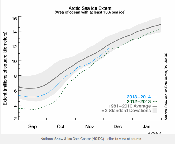 Record cold (including the coldest temperature ever recorded on earth a few days ago), above average early season snows and — yes, Arctic ice back into normal (the blue line back within the gray tinting below) —