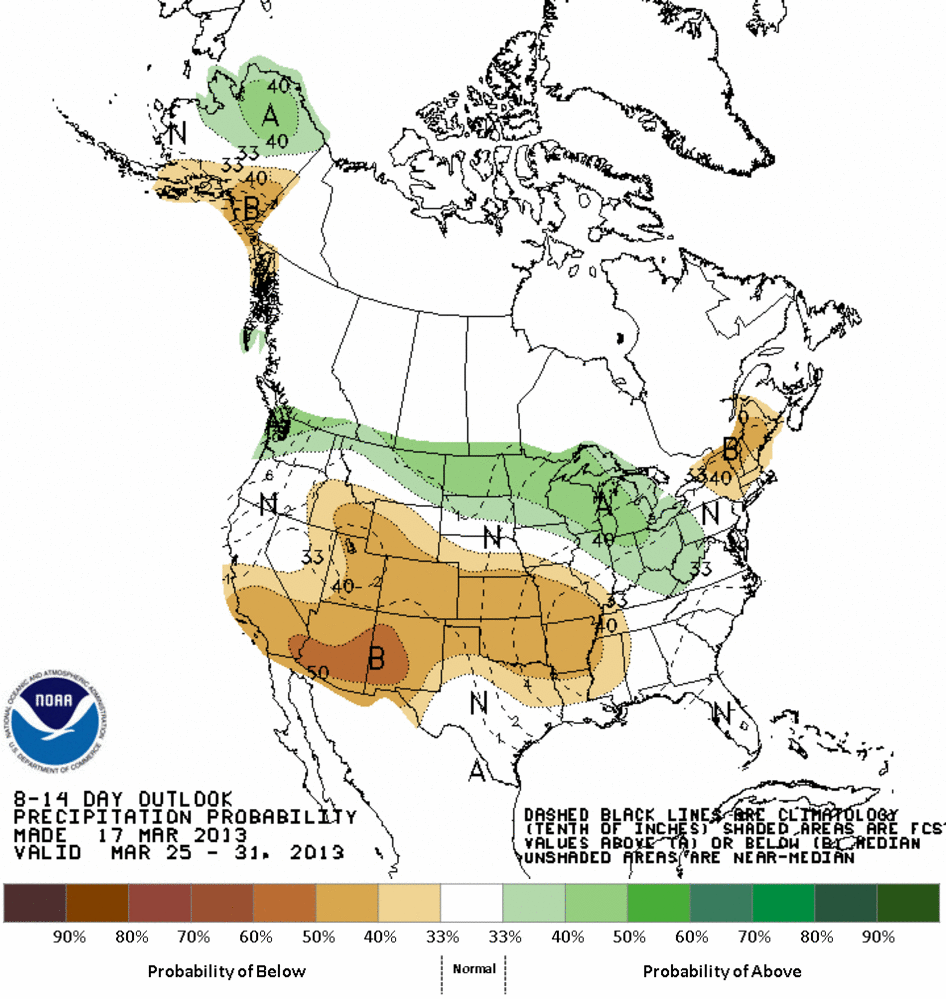 The temperature (burnt orange, warmer than normal, to blue, colder than normal) and precipitation (green, wetter than normal, to brown, drier than normal) outlooks for, respectively, the spring and summer predicts a warmer-than-normal spring and summer for us Sconnies. (Which will be required for the aforementioned snowpile to melt by Independence Day.) Of course, the further into the future you go, the less the forecasts are.