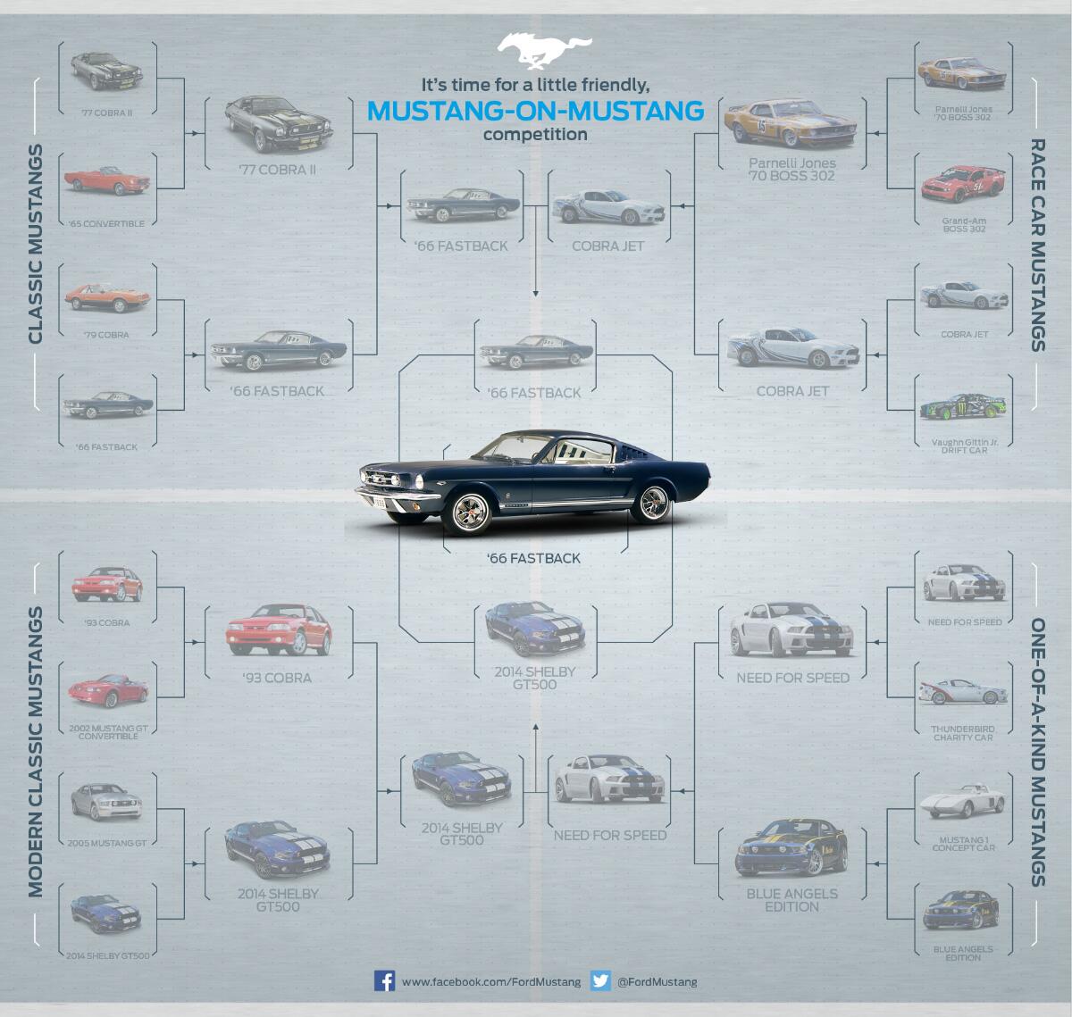 Ford also held a Twitter contest for the favorite Mustang based on these options, none of which included the Bullitt Mustangs, original or replicas: