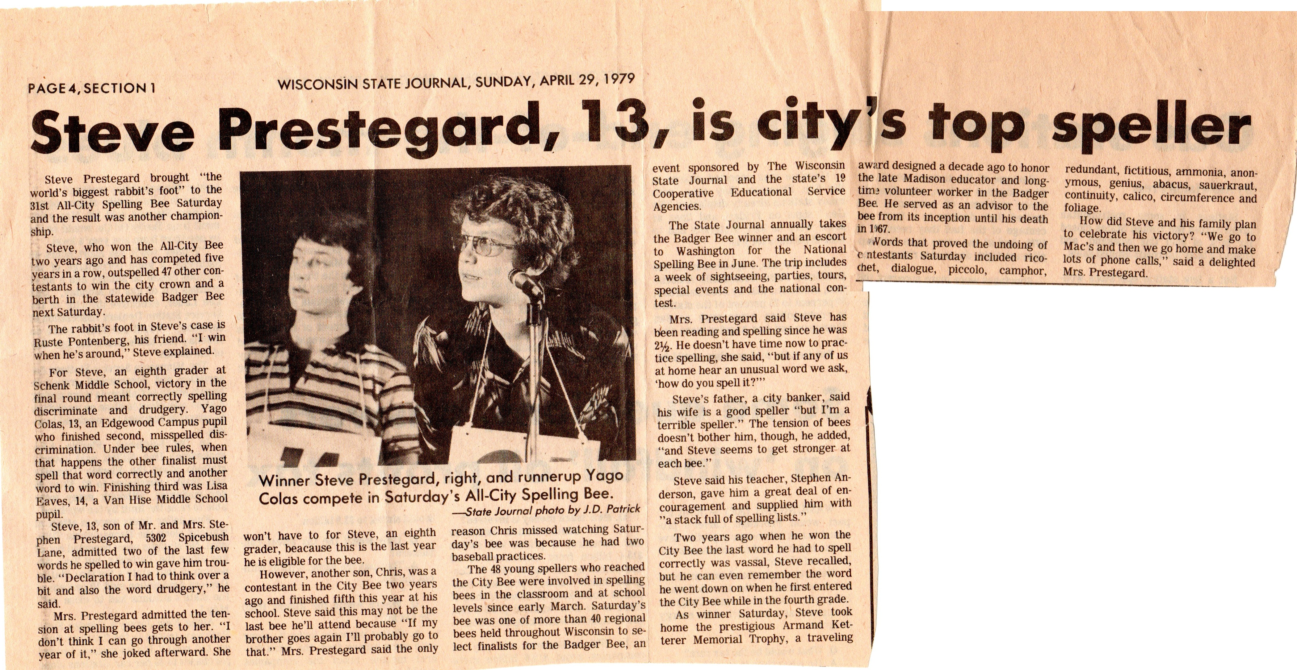 This is a photo of the top 10 finishers at the 1979 Madison City Spelling Bee. The kid on the lower right finished in second place. When he found out I was on Facebook, he sent this photo to me, along with the next day’s story …