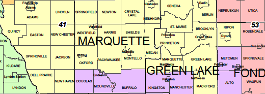 Meanwhile, the proposed 41st Assembly District (shown in tan on both of these maps) will run from the Wisconsin River between Adams and Juneau counties east to Ripon …
