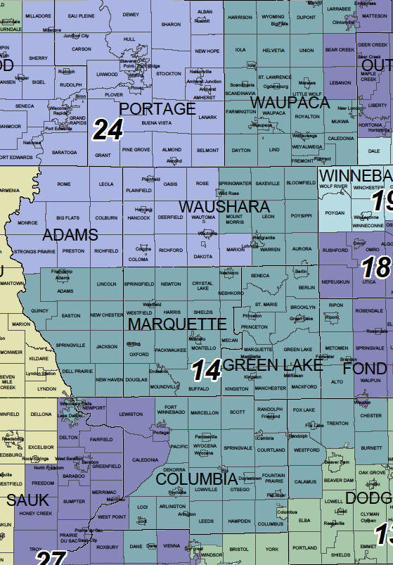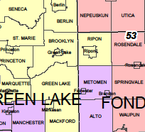 After Rep. Red Fred Clark (D–Baraboo) loses the 14th Senate District recall election to Sen. Luther Olsen (R–Ripon), Clark will still have to wander around the Ripon area because the 42nd Assembly District’s boundaries (purple on this map) are as far north as the town immediately south of Ripon, Metomen. That’s after Clark moves back into the 42nd, because Clark’s house reportedly isn’t in this version of the 42nd Assembly District. Go one town to the east of Ripon (the Town of Rosendale), and you’re not in the 14th Senate District or the 42nd Assembly District, you’re in the 18th Senate District and the 53rd Assembly District (shown in pink).