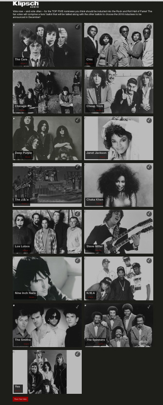 The J.B.s, Chic, Janet Jackson, Chaka Khan, Los Lobos, N.W.A and the Spinners’ inclusion on the ballot depends, I suppose, on your definition of “rock and roll” as well as popularity longevity. The J.B.s were James Brown’s backup band. Chic had radio airplay for a few years, as did Los Lobos. Does disco and rap count as “rock”?